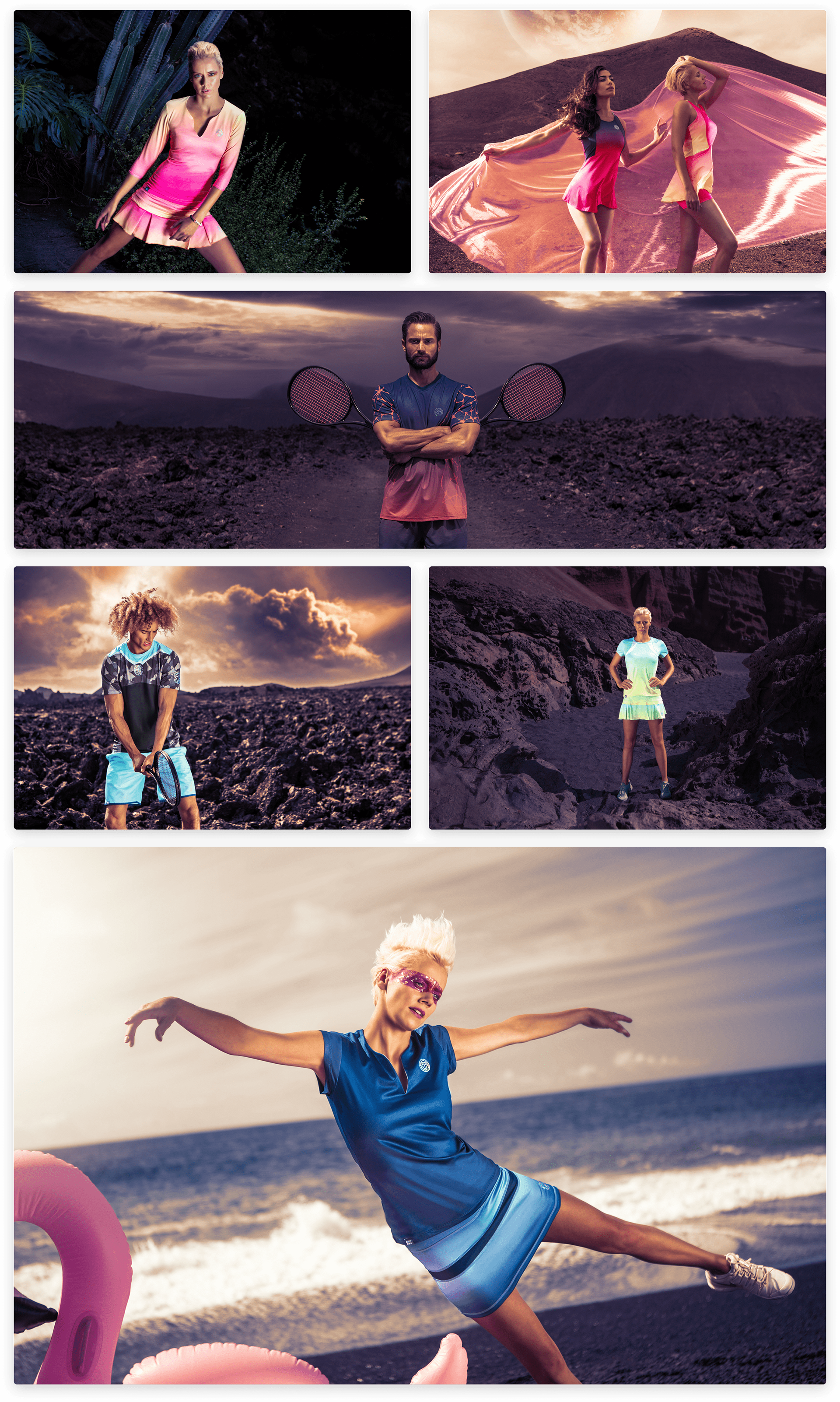 Conceptual design, artdirection and branding of a photo shooting for an international tennis fashion brand. Editing of the pictures and key visual composing.